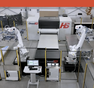 The Onset is available with several different automation options, from semi-automatic loading to full robotic automation. The latest automation solution, Dual Flex, is a unique, fully automatic solution that enables printers to transition seamlessly between lay table loading and dual robot automation. This solution provides the full capability to load and unload flexible, semi-rigid, and rigid sheets with a seamless switch from one operation to the other. Full automation is maximized with the dual robots, and this vacuum-to-vacuum transfer ensures precision handling, from the robotic arm pickup to placement on the print bed and stacking of the printed board. Load from a single stack to 1, 2 or 3-up on the vacuum table using the Load robot. Unload from the vacuum table to an uncollated stack using the Unload robot. Multiple stack pick capabilities are available as part of non-standard configuration options.