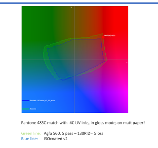 Another essential advancement is the enhanced color gamut of Onset 560 UV inks. Using the power of the Onset 560 gloss mode, users can match the Pantone 485C spot color on standard matte paper. This remarkable accomplishment was previously only achieved with solvent inkjet systems. Now PSPs can reliably meet Pantone 485C red color requirements of many popular brands. Refer to the attached gamut map.