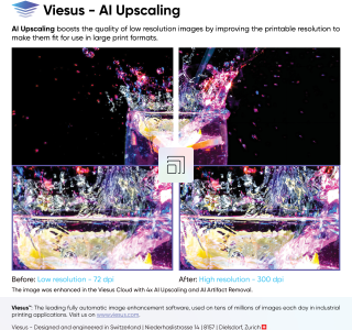 With the new AI Upscaling, Viesus enables photo and print service providers to produce large, high-quality prints from small source files by increasing the printable resolution of an image by up to factor 8x. Along with AI Artifacts Removal, the initial quality of compressed images can be restored and even further improved through the removal of JPEG compression artifacts, pixelation and blocking.