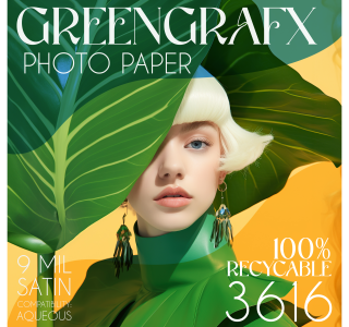 Introducing 3616 GreenGrafX 9 mil Satin Photo Paper: a revolutionary product as the world's first fully recyclable photo paper, proudly made in Germany and FSC® certified. GreenGrafX Photo Paper features an exclusive barrier and microporous coating, replacing the traditional PE film found in conventional photo papers, thus offering an environmentally friendly and fully recyclable media option.